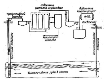 Сущность подземного выщелачивания ПИ заключается в избирательном переводе полезного компонента в жидкую фазу путем управляемого движения растворителя по руде в естественном залегании или подготовленного к растворению и подъему насыщенного металлом раствора на поверхность. С этой целью через скважины, пробуренные с поверхности в пласт полезного ископаемого нагнетается химический реагент, способный переводить минералы полезного ископаемого в растворимую форму. Раствор, пройдя часть рудного пласта, через другие скважины поднимается на поверхность и далее по трубопроводу транспортируется к установкам для переработки.
