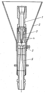 1 – присоединительный переводник; 2 – воронка; 3 – насадка; 4 – окна; 5 – камера смешения; 6 – диффузор