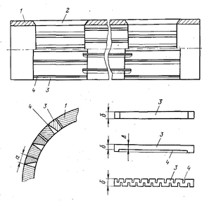 При оборудовании глубоких скважин (350 – 600 м) для предохранения фильтра от смятия под действием горного давления применяются каркасы фильтров из нержавеющей стали. Однако при наличии в продуктивном горизонте тонкозернистых песков нарезка отверстий необходимого размера в металлических трубах из нержавеющей стали представляет значительную трудность. Получить отверстия размером 0,3 – 1 мм с различной конфигурацией можно с помощью вставных планок (см. рис 16). В этом случае проектные отверстия на каркасе выполнены на боковых сторонах планок, закрепленных в щелях, нарезанных на фильтровой трубе. Крепление планок в щели может выполняться склеиванием, сваркой, припоем, на хомутах и др.