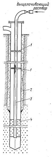 1 – отражатель; 2 – эксплуатационная колонна; 3 – раствороподающая колонна; 4 – фильтр