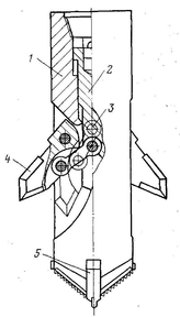 1 – корпус; 2 – поршень; 3 – тяга; 4 – лопасти; 5 – породоразрушающий наконечник