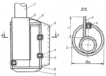При сооружении технологических скважин ПВ широкое применение находят гидромеханические эксцентриковые расширители, сконструированные на кафедрах «Разведочного бурения» и «Геотехнологии руд» МГРИ (рис. 28). Корпус расширителя представляет собой трубу, а режущим элементом является лопасть 3, армированная твердосплавными резцами. Для повышения эффективности разрушения пород и очистки лопастей от шлама в корпус расширителя вмонтированы насадки 4. Расширитель имеет замковую резьбу для присоединения к бурильным трубам. Рабочая лопасть расширителя приваривается к замку от бурильных труб диаметром 73 мм. На расширитель надевается корпус, который выполняется из трубы, диаметр которой зависит от диаметра расширяемой скважины. Сверху и снизу к корпусу привариваются крышки 6 и 7, а в корпусе делаются отверстия, к которым привариваются гнезда для гидромониторных насадок. Внутренний диаметр гидромониторных насадок обычно принимается равным 9 или 10 мм, что обеспечит получение высокой скорости струи на выходе из насадки.