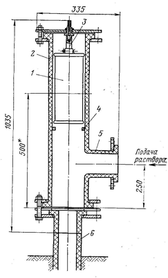 Для нагнетательных скважин, работающих в напорном режиме, применяется оголовок, показанный на рис.24. Оголовок состоит из корпуса патрубка для подачи выщелачивающих растворов и поплавка с запорным органом. В рабочем состоянии поплавок находится в верхней части корпуса и с помощью запорного органа перекрывает отверстие в крышке корпуса. Выщелачивающий раствор под давлением непрерывно нагнетается в скважину, а образовавшиеся газы скапливаются в верхней части оголовка. При давлении газов выше давления растворов поплавок перемещается вниз и временно открывает отверстие для выхода газов.