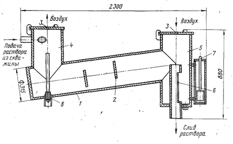 1 – корпус; 2 – перегородки; 3 – отверстия для выхода воздуха; 4 – камера для раствора, поступившего из скважины; 5 – камера слива; 6 – патрубок слива; 7 – поплавковый расходомер; 8 – пробка