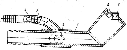 Расширитель гидравлический, показанный на рис. 30, позволяет периодически очищать забой скважины от разрушенной породы. Он опускается на забой на бурильных или насосно-компрессорных трубах, в нижней части которых выполнены отверстия для смесителя эрлифта. Сверху отверстия в смесителе эрлифта плотно закрываются патрубком, который приваривается к наружной поверхности трубы. В патрубке имеются отверстия для подачи воздуха по трубам меньшего диаметра или по шлангам. Насадки монтируются в нижней части бурового инструмента в специальном подвижном клапане.