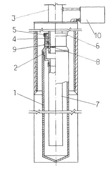 промывочную муфту 2 и со скважинным фильтром через дополнительную и промывочную трубу 7 соответственно в верхнем и нижнем положениях клапана 4. Промывочная труба 3 соединена с прискважинной камерой 10 гибким рукавом.