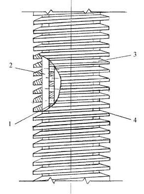 Витки профилированной проволоки 3 (или наборные кольца) выполнены с прямоугольными гранями в сечении и скошенными верхними гранями с наружной стороны витков под углом 4 к горизонту, соответствующим углу естественного откоса пластовой породы или гравийной набивки в среде фильтрующего агента.