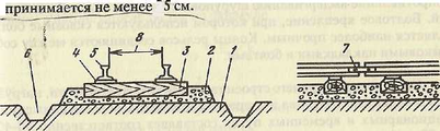 1 - земляное полотно; 2 - балласт; 3 - шпала; 4 - подкладка; 5 - рельс; 6 - водоотводная канава; 7 - накладка; 8 - ширина колеи