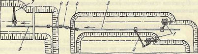 Рисунок 6.6 - схема перемещения вскрышных пород во внешние отвалы: 1 - роторные экскаваторы; 2 - перегружатель; 3 - забойный конвейер; 4 - наклонный конвейер; 5 - магистральный конвейер; 6 - отвальный конвейер; 7 - отвалообразователь