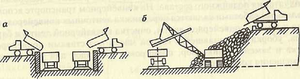 а - с непосредственной перегрузкой пород; б - с временным складом и использованием на погрузке экскаваторов
