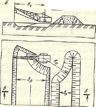 При возведении отвала на равнине первоначальная насыпь сооружается из пород выемки, проводимой вблизи насыпи параллельно ее оси, или из вскрышных пород. В зависимости от типа вскрышных пород и вида карьерного транспорта первичная насыпь может сооружаться драглайнами, мехлопатами, бульдозерами и колесными скреперами (рис. 7.2, 7.3, 7.4, 7.5).