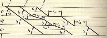 В случае примыкания на руководящем подъеме вынужденная остановка транспортных средств происходит непосредственно на участке с руководящем подъемом. Удельная сала сопротивления движению в момент трогания в этом случае значительно превышает аналогичную силу при равномерном движении по руководящему подъему. При таком продольном профиле трассы для обеспечения трогания с места после остановки требуется увеличение сцепного веса локомотива на 10-50%. Однако в этом случае обеспечиваются минимальная длина трассы и минимальный объем системы капитальных траншей.
