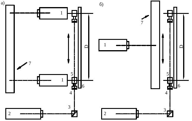 а) когда нивелир перемещается вдоль растровой меры, б) когда рейка перемещается вдоль растровой меры: 1-исследуемый нивелир, 2-лазерный интерферометр, 3-разворачивающий блок интерферометра, 4-отражатель интерферометра, 5- растровый измерительный преобразователь, 6-стеклянная растровая мера, 7- нивелирная рейка.