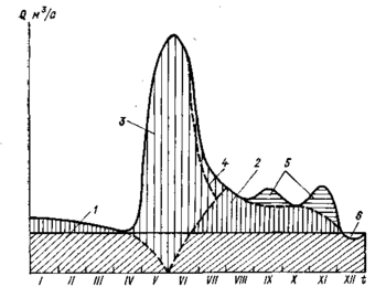 1 — глубокое подземное питание, 2 — верховое подземное питание, 3 — снеговое половодье. 4 — отдача поймы, 5 — дождевые паводки, 6 — потери стока воды на образование льда