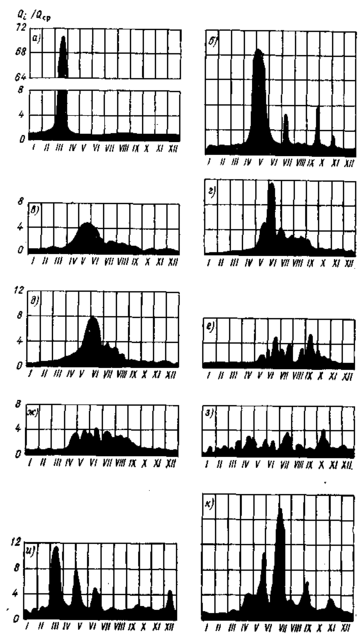 Реки третьей группы в зависимости от характера распределения паводков в течение года делятся на три типа.