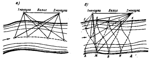 При промерах по продольникам (рис. 2.6 а) на базисе устанавливают два угломерных инструмента (мензулы с кипрегелями, теодолиты и т.п.). Лодка (катер) перемещается по течению примерно параллельно береговой линии. В момент измерения глубины по сигналу с лодки засекается положение промерной вертикали одновременно двумя инструментами. Продольники назначаются обычно через 1/10-1/20 ширины реки, у берега чаще, чем в средней части реки.