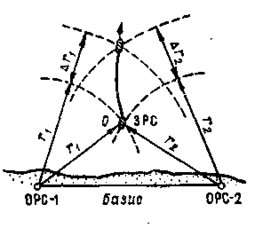 На крупных озерах и водохранилищах, когда отсутствует прямая видимость берегов, координирование промеров выполняют радиогеодезическими методами. На берегу разбивают базис, на концах которого устанавливают две радиостанции, называемые отражающими (ОРС). Третья радиостанция — задающая (ЗРС) — размещается на судне (рис. 2.7). При движении судна по заданному галсу производится измерение глубины эхолотом. Местоположение судна засекают с помощью непрерывно работающих задающей и отражающих радиостанций.