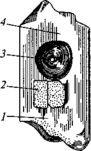 Рис. 1.2. Микрополости в кварце: 1 – кристалл сильвина; 2 – кристалл галита; 3 – пузырек газа; 4 – жидкая фаза. Прозрачный шлиф, увеличение 900