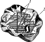 Рис. 1.1 Включение акцессорных апатита (1) и циркона (2) в зерне полевого шпата. Прозрачный шлиф, увеличение 160