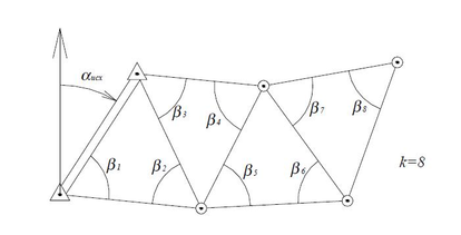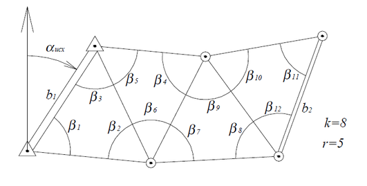 Крім того, вимірюються r надлишкових (додаткових) величин, необхідних для відбракування грубих вимірів, підвищення точності визначення шуканих параметрів і для оцінки точності вимірів і визначуваних параметрів (рис. 2). Наприклад, в приведеній раніше мережі тріангуляції необхідно виміряти додатково треті кути в трикутниках і вихідний (останній) базис і так далі.