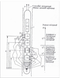 Взаимное расположение в скважинном приборе источника нейтронов и детекторов, используемых в нейтронных методах каротажа, показано на рис.1. Измерения в нейтронных методах обычно производят в геометрии 4π, и нейтронное облако вокруг скважины и вызываемые им гамма-поля обладают осевой симметрией. Пунктирные траектории нейтронов, иллюстрирующие процессы взаимодействия и ядерные реакции, идущие на быстрых и медленных нейтронах, показаны на рисунке условно.