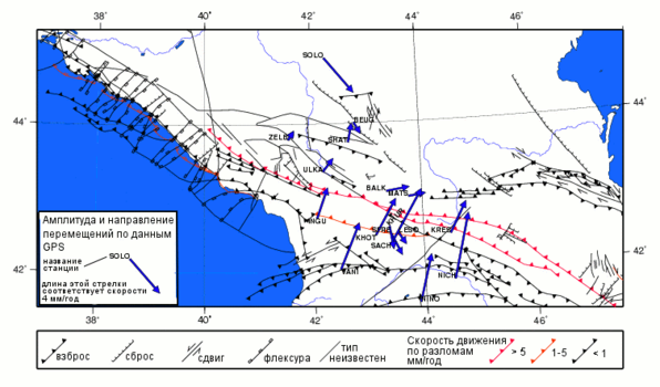 На рис. 3 показано положение станций GPS и скорости их перемещения относительно Евразийской плиты. На карте также дано положение основных активных разломов. На рис. 3 хорошо видно, что движение Аравийской плиты в северо-западном направлении частично компенсируется выжиманием Анатолийской плиты на запад. В результате горизонтальные движения на Малом Кавказе в основном направлены на северо-восток. Сравнивая длины стрелок можно заметить, что основная часть движения компенсируется сжатием на Малом Кавказе и лишь небольшая часть транслируется далее на север и компенсируется за счет сжатия на Большом Кавказе и, возможно, в Северном Предкавказье.