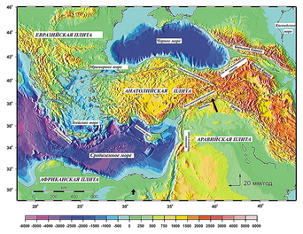 Тектоника этого обширного региона в основном определяется коллизией Аравийской и Африканской плит с Евразийской плитой (см. например, DeMetzetal., 1990). Модели, основанные на глобальном анализе данных о движении различных плит, показывают, что относительно Евразийской плиты Аравийская плита движется в северо-северо-западном направлении со скоростью около 18-25 мм/год (скорость осредненная за последние 3 млн. лет). Африканская плита движется на север с меньшей скоростью, равной 10 мм/год, что и вызывает левосторонний сдвиг вдоль зоны разломов Мертвого моря. Продвижение Аравийской плиты на север ответственно также за формирование горного сооружения Загроса, формирование высокогорных плато Восточной Турции и рост горных сооружений Малого и Большого Кавказа.