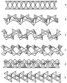 Следующей ступенью полимеризации являются соединения, содержащие ленточные кремнекислородные радикалы. Некоторые виды этих радикалов, зависящие от природы катионов, представлены на рис. 3. Во времена У.Л. Брэгга такие соединения еще не были известны. К ленточным силикатам относятся амфиболы – гидросиликаты Ca, Mg, Fe, содержащие группы [Si4O11] 6 – К амфиболам относится и один из древнейших минералов, используемых человеком, – нефрит – Ca2 (Mg, Fe) [Si4O11] (OH) 2, и асбесты.
