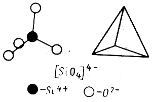 Силикаты характеризуются сложным химическим составом и внутренним строением. В основе их структуры лежит кремнекислородный тетраэдр (см. рис.), в центре которого находится ион кремния Si4+, а в вершинах - ионы кислорода О2-, которые создают четырехвалентный радикал [SiO4]4-.