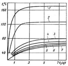 Рис. 22- Изменение температуры на забоях скважины во времени при электропрогреве: 1 - 21 кВт; 2 - 10,5 кВт; 3, 4 - 21 кВт; 5, 6, 7 - 10,5 кВт.