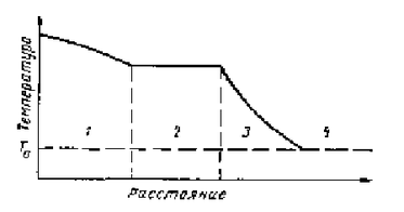 Рис.31- Схема распределения температуры в пласте при нагнетании в него водяного пара. Зоны: 1 – перегретого пара: 2 – насыщенного пара; 3 – горячего конденсата: 4 – остывшего конденсата.