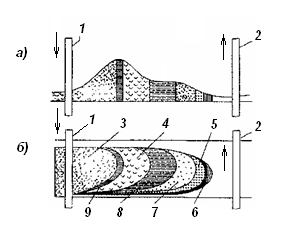 а – темпсратурные зоны в пласте, б – зоны распространения процесса: 1,2 – нагнетательная и добывающая скважины; 3.4,7.8 – зоны: соответственно выжженная, испарения, конденсации и пара; 5 – легкие углеводороды; 6 – нефтяной вал; 9 – фронт горения.