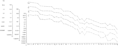Из химических элементов лишь немногие превышают кларковые: С, Мg, Са, К, Р, S, N, Мn, а также Сu, Zn, Аg, Мо, V. В первичном мумие относительно вторичного больше К, Р, Fе, N, О, карбоксилов, углекислоты, Сu, Рb и др.; в «горном воске» значительны превышения по калию и фосфору, но нет отличий по N и микроэлементам. В геохимических спектрах (рис.3) начало занимают концентрации газообразных, углерода, золы, замыкают - Yb и Ве, причем поареальные отличия руд мумие сказываются мало.