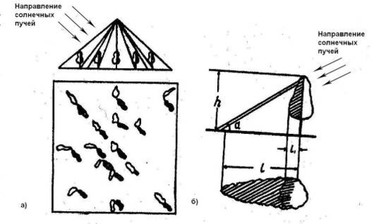 а – отклонение изображений высоких объектов. Тени объектов заштрихованы; б – определение высоты дерева h по длине его падающей тени l.