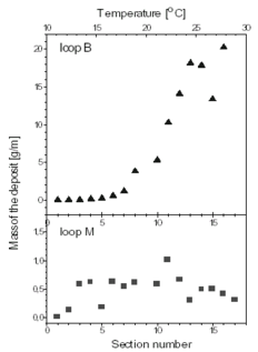 Количество отложений, выраженное в граммах/метр трубы приводится для двух контуров на Рисунке 3. В контуре В (смотри Рис.3а) количество отложений возрастало экспоненциально с увеличением расстояния и температуры, начиная с нулевого значения для первых трех секций и достигало 20 г/м на горячем конце.