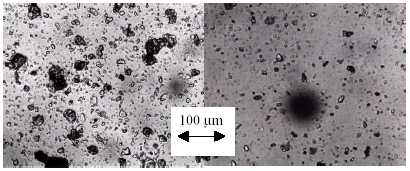 Рисунок 4. Микроскопическая картина отложений для необработанной (слева) и обработанной воды (справа).