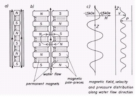 Кольца (постоянные магниты) были намагничены параллельно их осям симметрии. Диаметр полюсных наконечников был больше диаметра магнитов на 4 мм, благодаря этому скорость водного потока периодически изменялась (от 1.0 до 1.6 м/с) в дополнение к изменению профиля поля. Амплитуда поля составляла 120 кА/м (1.5 kOe3). Давление в потоке воды также периодически изменялось, характер этих изменений показан на Рисунке 2c.