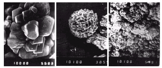 На рисунке 11 представлены сравнительные SEM фотографии исследованных веществ. Кристаллиты чистого CaCO3 показаны слева, в середине – пример open-work сферы CaCO3.H2O. Сферы, подобные этой, или закрыто-упакованные сферулиты [spherulites] были получены нами при проведении лабораторных исследований кинетики кристаллизации карбонатов. Они имели обыкновение кристаллизоваться в воде с высокой концентрацией магния [20]. Влияние иона магния на кристаллизацию полиморфов CaCO3 недавно был исследовано в [21]. SEM фотография справа на рисунке 11 демонстрирует пример образования аморфного отложения в теплообменнике с магнитной обработкой воды. Было проанализировано большое количество фотографий для MWT отложений, все они имели подобный вид.
