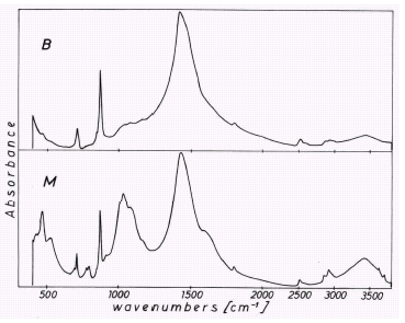 Рис.7 Спектры ИК поглощения отложений из В (необработанная) и М (обработанная магнитным полем вода) контуров.