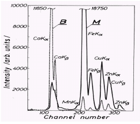 Анализ, проведенный методом PIXE для пары образцов из B и М секций номер 15 (см. рис. 5), дает тот же самый результат: содержание Cu, Zn, и Mn в несколько раз, а Fe более чем в десять раз больше в отложениях из контура M.