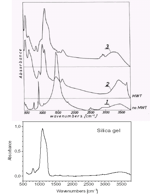 Рисунок 10a представляет ИК спектры, полученные с помощью “Digilab" спектрометра с анализатором гармоник. Кривая 1 – соответствует чистому кальциту. Кривая 2 - типичный спектр отложений из воды, обработанной магнитным способом. Подобно спектру М на рисунке 7, здесь имеется примечательное увеличение полосы 1050 cm-1, обусловленной гидрозолем кремнезема, и с другой стороны, подавление полос кальцита. Кривая 3 демонстрирует адсорбционные свойства MWT отложения после его обработки 5% раствором HCL (тот же самый результат был получен с 1-молярной ацетатной кислотой). Главные особенности полученного спектра идентичны таковым обычного силикагеля, IR спектр которого приведен на рисунке 10b. Это позволяет сделать предположение, что данное вещество является кремнеземом, который обуславливает наблюдаемые для MWT особенности. Небольшой пик прочного кальцита в области 850 cm-1 отмечаются в спектре 2, а также на 1500 cm-1 и имеет приблизительно 5 % интенсивности спектра 2. Колебания абсорбированной воды в диапазоне 3200 - 3600 cm-1 - приблизительно в 4 раза более слабые в кальците, чем на кривой 2, которая обусловлена высокой концентрацией воды в отложениях MWT. Пик на 3700 cm-1 обусловлен brucite. Изменения полученные после обработки MWT отложения 5 % HCl следующие: полоса 1550 cm-1 соответствующая кальциту исчезает, тот же самый наблюдается для 3700 cm-1 полосы brucite. Полосы 1000 и 1100 cm-1 кривой 2 смещаются приблизительно к 1100 cm-1 и 1200 cm-1, что вероятно связано с полимеризацией гидрозолей кремнезема.