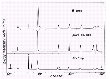 Рисунок 6. Исследование дифракции рентгеновских лучей (Cu излучение) на образцах из обоих контуров: сравнительная картина для образцов из контуров и образцом чистого кальцита.