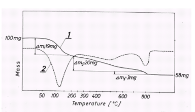 Контроль воды и содержания CO2 в отложениях после MWT проводился двумя независимыми способами. В качестве другого метода использовался термогравиметрический анализ (DTA) отложений из Блока 10 выполненный с использованием прибора Мётлера [Motler]. Кривая 1 на рисунке 8 иллюстрирует зависимость массы как функции температуры. Потеря воды (влажности) происходит при 1400C и сопровождается изменением массы m1 19 %, потеря кристаллизационной воды происходит при 7500C и приводит к m1 20 % и потере CO2, дальнейший нагрев в диапазоне 7500C – 8000C дает m1 3 %. Кривая 2 иллюстрирует производную изменения массы. Таким образом, при различных методах исследования, в отложениях обнаруживается недостаток карбонатов. Вероятным объяснением малого количества CO2, обнаруживаемого методом DTA, может быть кристаллизация карбонатов до входа в блок.