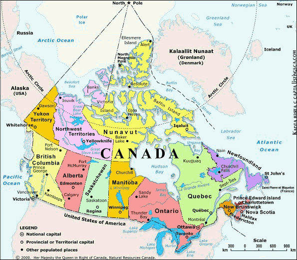 анада является второй по величине страной в мире (9 970 610 кв. км.), которую превосходит по размерам только Россия. Канада расположена на север от США, между Атлантическим и Тихим океанами. С запада на восток она достигает 7700 км, а с севера на юг - 4600 км. Почти 90% всего населения Канады живут в пределах 160 км от границы с США. Столица Канады - город Оттава в провинции Онтарио.
