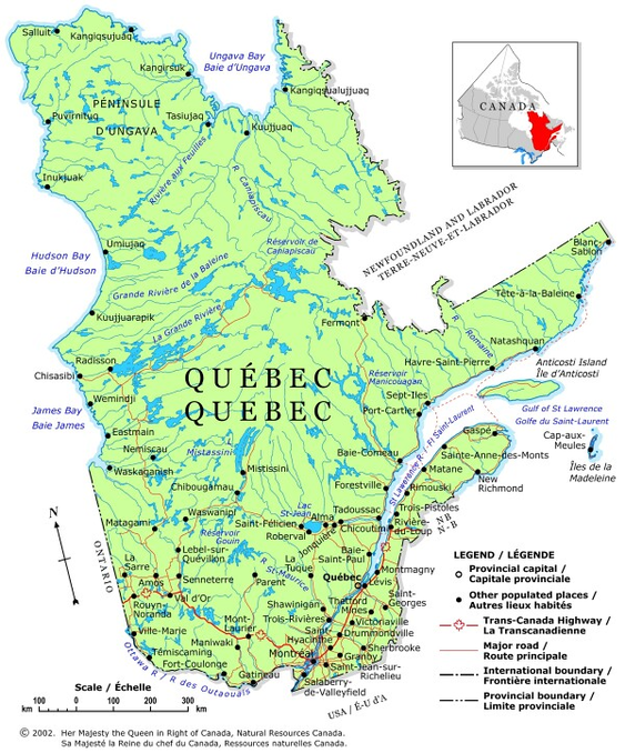 Квебек - самая большая провинция Канады. Она граничит с Онтарио, Нью-Брансвиком, Новой Землей и США. Квебек занимает 1540680 кв. км, что в три раза больше Франции и в семь раз - Великобритании. Естественными границами провинции являются внутренние воды страны - Гудзонов пролив, река Св. Лаврентия и залив Джеймса, а также Атлантический океан.