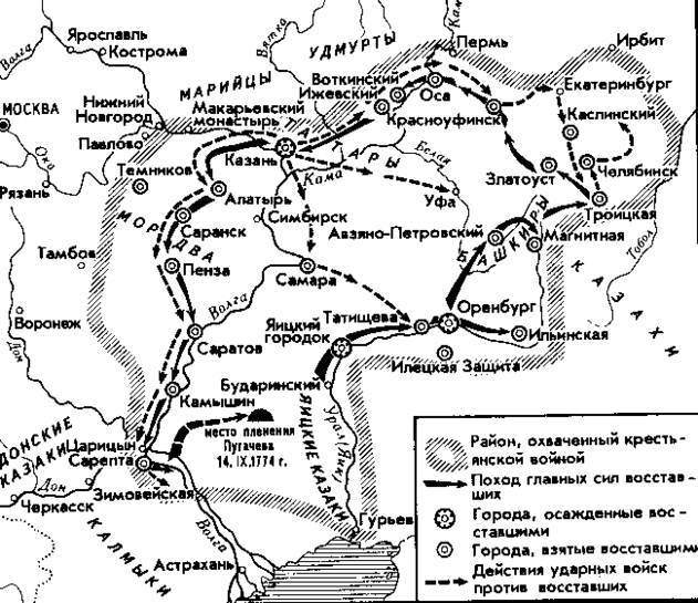 Правительственные войска поспешили под Казань. Здесь Пугачеву было нанесено жестокое поражение. С отрядом в несколько сот человек вождь повстанцев переправился на правый берег Волги и вступил на территорию, где большинство населения составляли крепостные, а также государственные крестьяне из татар, чувашей, марийцев и мордвы. Июль и август 1774 г. стали самыми тяжелыми месяцами для правительства и дворянства. Восстание охватило сотни селений, пылали помещичьи усадьбы. Опять вокруг Пугачева собралось множество повстанцев. К лету 1774 г. относятся самые выразительные указы самозванца. В одном из них говорилось: