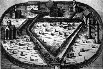 ачалось устроение опричнины. Прежде всего, сам царь, как первый опричник, поторопился выйти из церемонного, чинного порядка государевой жизни, покинул свой наследственный кремлевский дворец, перевез все на новое укрепленное подворье, которое велел построить себе где-то среди своей опричнины, между Арбатом и Никитской, в то же время приказал своим опричным боярам и дворянам ставить себе в Александровской слободе дворы, где им предстояло жить, а также здания правительственных мест, предназначенных для управления опричниной. Скоро он и сам поселился там же, а в Москву стал приезжать «не на великое время». Так возникла среди глухих лесов новая резиденция, опричная столица с дворцом, окруженным рвом и валом, со сторожевыми заставами по дорогам. В этой берлоге царь устроил дикую пародию монастыря, подобрал три сотни самых отъявленных опричников, которые составляли братию, сам принял звание игумена, а князя Афанасия Вяземского облек в сан келаря, «покрыл этих штатных разбойников монашескими скуфейками, черными рясами, сочинил общежительный устав, сам с царевичами по утрам лазил на колокольню звонить к заутрене, в церкви читал и пел на клиросе и клал такие земные поклоны, что со лба его не сходили кровоподтеки. После обедни за трапезой, когда веселая братия объедалась и опивалась, царь за аналоем читал поучения отцов церкви о посте и воздержании, потом одиноко обедал сам, после обеда любил говорить о законе, дремал или шел в застенок присутствовать при пытке заподозренных».