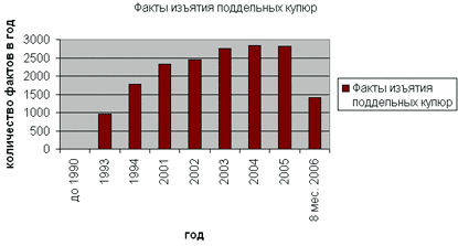 Если в Беларуси до 1990г. регистрировались единичные факты изъятия поддельных купюр, то в 1993 году их насчитывалось уже 955, в 1994-м – 1784, в 2001 году – 2324, в 2002 – 2456, в 2003 – 2761, в 2004 - 2844, в 2005 - 2820, за 8 месяцев текущего года – 1399 фактов.