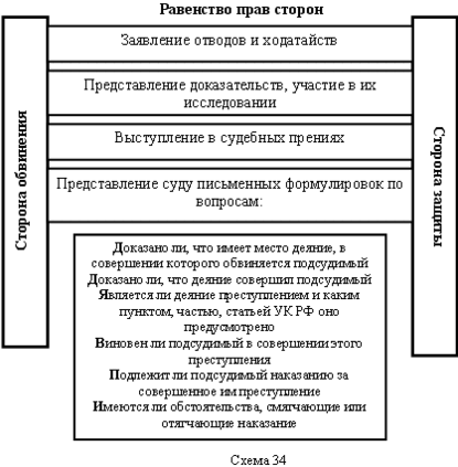 5. Правило равенства прав сторон предусматривает, что в судебном заседании стороны обвинения и защиты пользуются равными правами на заявление отводов и ходатайств, представление доказательств, участие в их исследовании, выступление в судебных прениях, представление суду письменных формулировок по вопросам, указанным в п. 1 – 6 ст. 299 УПК РФ: