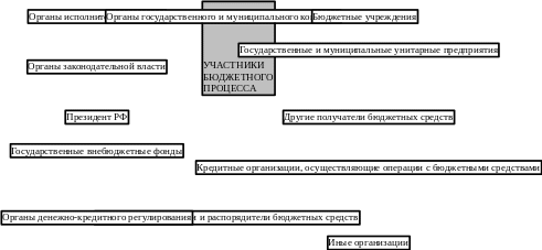 Участниками бюджетного процесса также являются бюджетные учреждения, государственные и муниципальные унитарные предприятия, другие получатели бюджетных средств, кредитные организации, осуществляющие отдельные операции со средствами бюджетов.